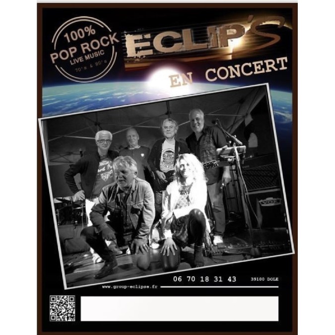Concert du groupe dolois Eclips. Ce groupe est né dans les années 80 et a régulièrement évolué au cours des années. Aujourd'hui 6 musiciens/ chanteurs vont reprendre, pour vous, les titres pop/rock standards dans une ambiance festive et chaleureuse.