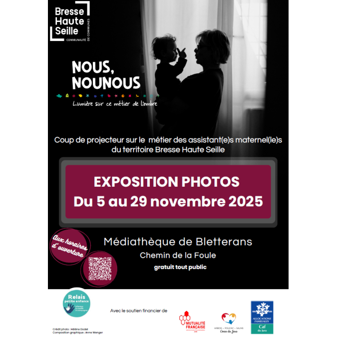 Du 5 au 29 novembre 2025, la Médiathèque Intercommunale accueille une exposition photographique consacrée au métier d'assistant (e) maternel (le) en collaboration avec le Service Petite Enfance. Photographié(e)s par Vincent Gartner, les professionnel(le)s du territoire Bresse Haute Seille vous font partager leur quotidien auprès des tout petits : premières découvertes, moments de complicité, de joie, métier qui va bien au-delà d’un simple « mode de garde »