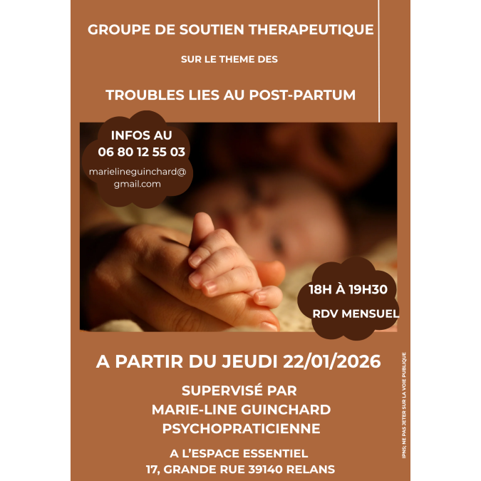 Groupe de soutien et de parole visant à proposer un accompagnement psychologique des troubles liés au post-partum tels que dépression, phobies d'impulsion, difficultés d'attachement mère/enfant.
