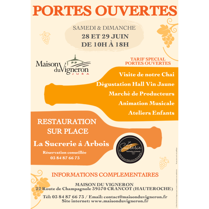 Venez nous rencontrer à l'occasion de nos portes ouvertes. Vous pourrez visiter notre chai, notre Hall à vin jaune, mais également profiter d'un marché de producteurs, d'animations musicales, et d'ateliers pour enfants. Vous pourrez aussi profiter de restauration sur place.