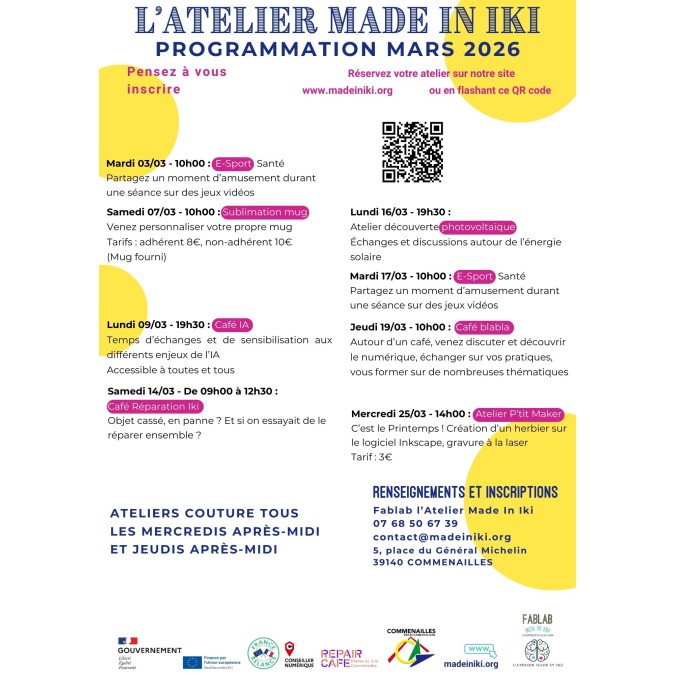 La programmation des ateliers prévus au Fablab pour le mois de mars est disponible !